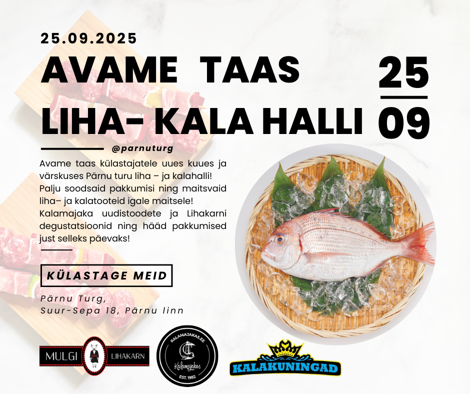 Seoses Pärnu Turul, Liha- Kala halli renoveerimisega oleme suletud 14-24 september.